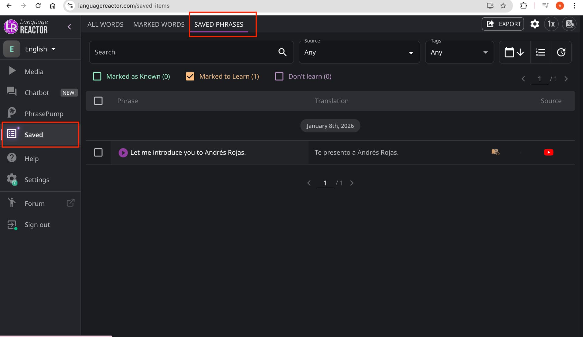 Once it turns yellow, it means it’s saved in the Saved section in the Saved phrases tab.(see screenshots below)