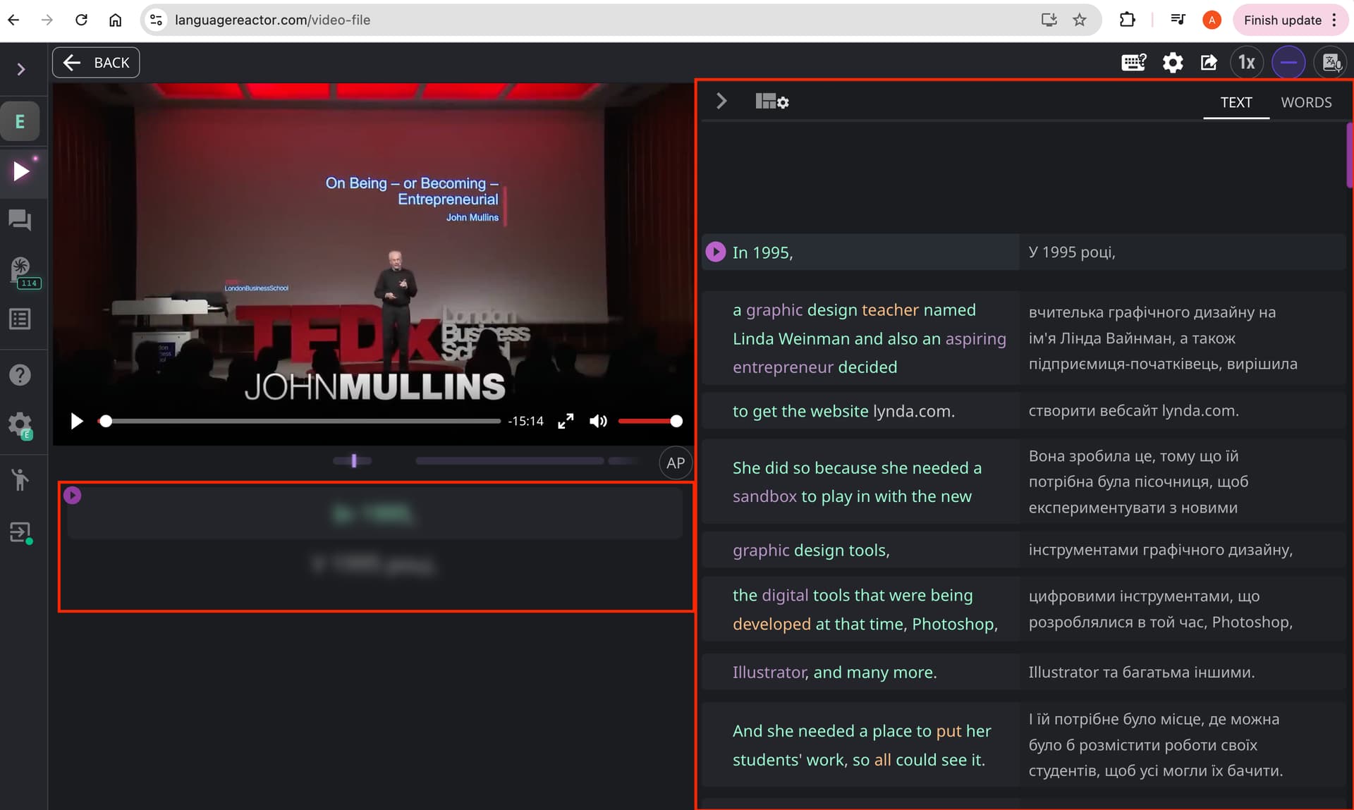 If you select “Subtitles then translation/Translation then subtitles”, the flow will look like in the screenshot. The subtitles and translation will appear blurred and will not draw attention to themselves, but the Subtitles list will be visible.