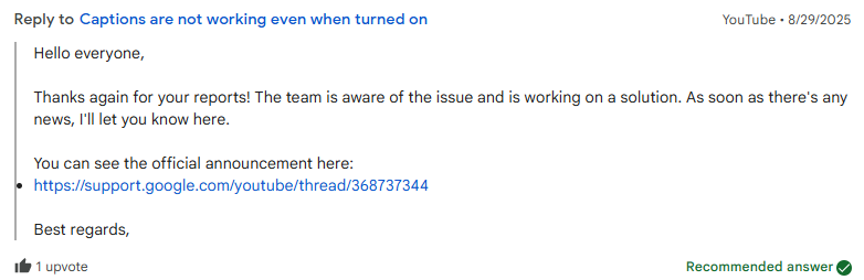 There is no confirmation from Youtube yet, but some subtitles are now working, although buggy.