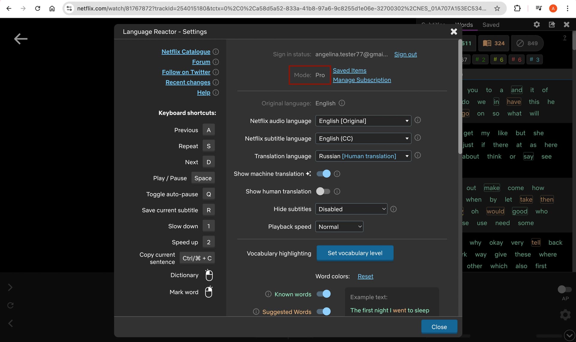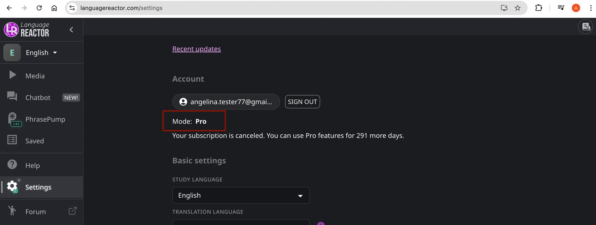 Can you see Mode:Pro in your account settings on Language Reactor? (see screenshot)