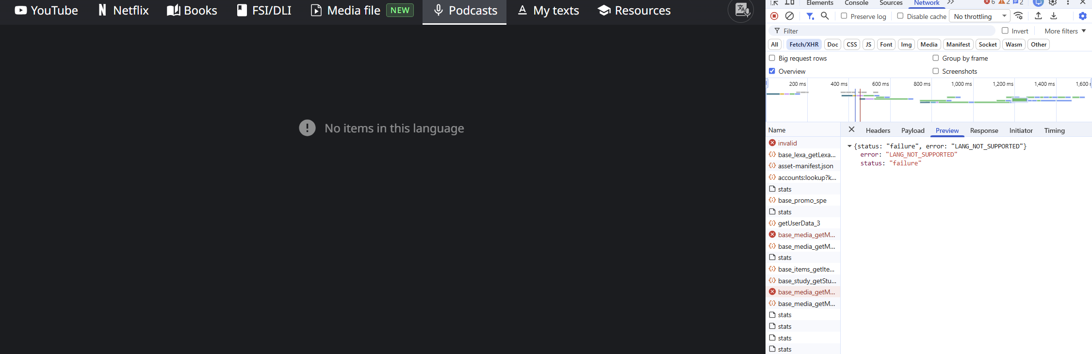 The podcast tab is not working for any language chosen-it just says “No items in this language”. It is the same if I switch to Spanish, Russian or any other language.