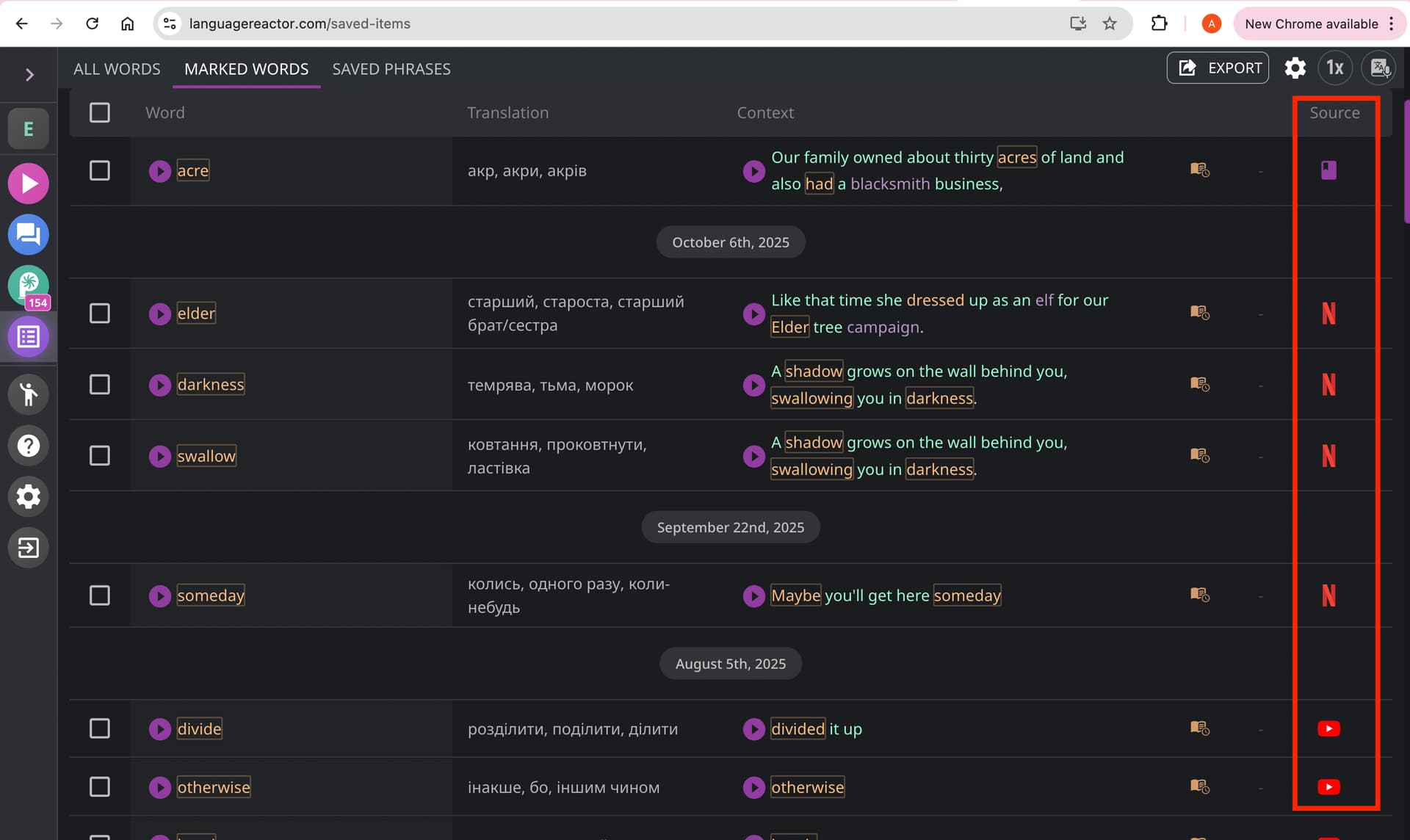 Thanks for your reply but I think it’s not the same functionality, LR shows the source of the saved items which is good but what I was talking about is having a search engine that would look in all the LR database of subtitles and that would display the list of fragments or like the Youglish system that jumps directly to the first fragment linked to the search and that allows you to jump to the following ones easily. You should try on youglish maybe I’m not very clear ![]()