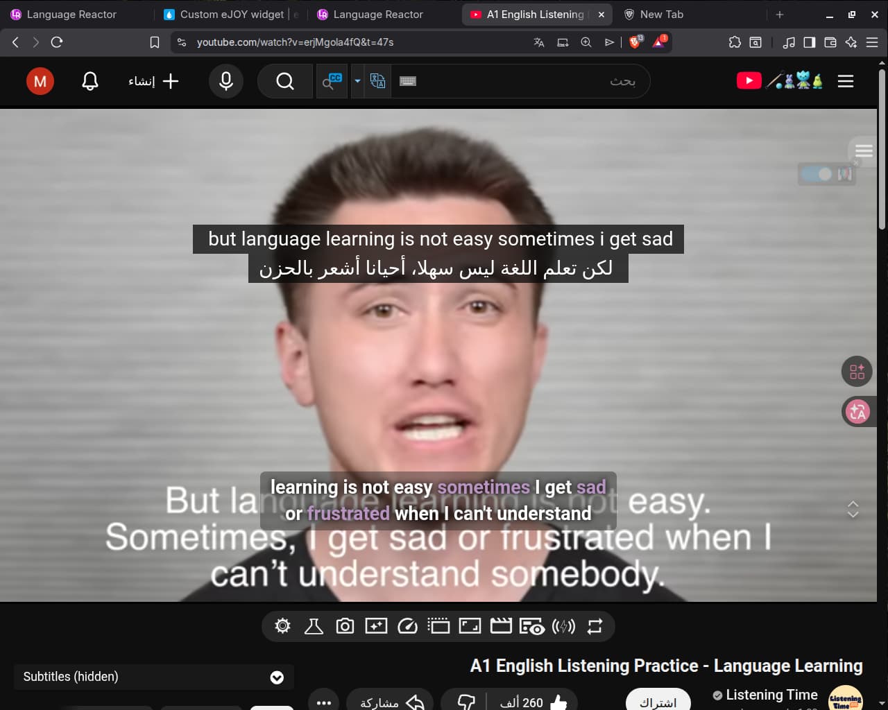 I have two English translations—I don’t mean the one provided by the video creator. I mean that when I use Language Reactor, I see English and Arabic subtitles together at the top, and another English subtitle at the bottom.