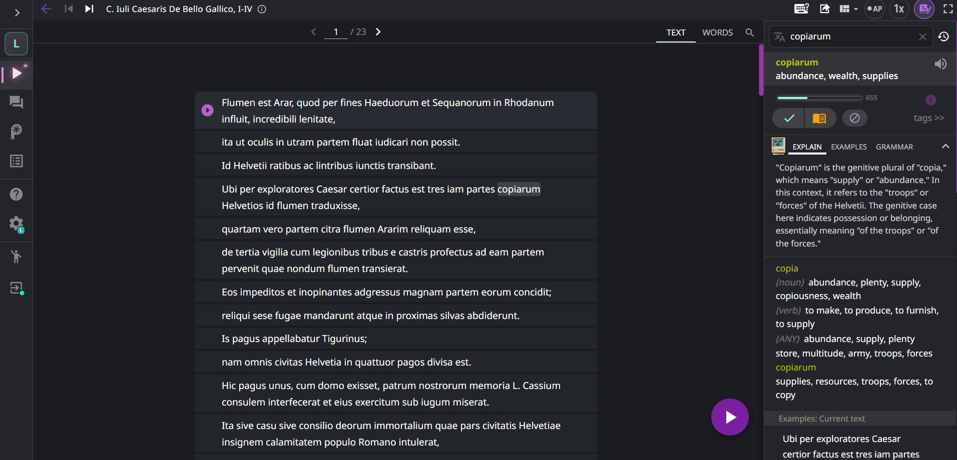 While Latin appears among the language options, and, even if it’s not a language you usually encounter in videos or movies, ithas some resources such as some added books and the possibility to use the dictionary by clicking individual words, with all the information containing grammar and all, some functionalities are lacking, such as the possibility to listen to the texts, and most importantly, no translations are offered for texts in Latin! While I think there are other requests commenting about the lack of audio for Latin, I have seen none about the fact that no translations appear for Latin, even for the books offered within the site.
