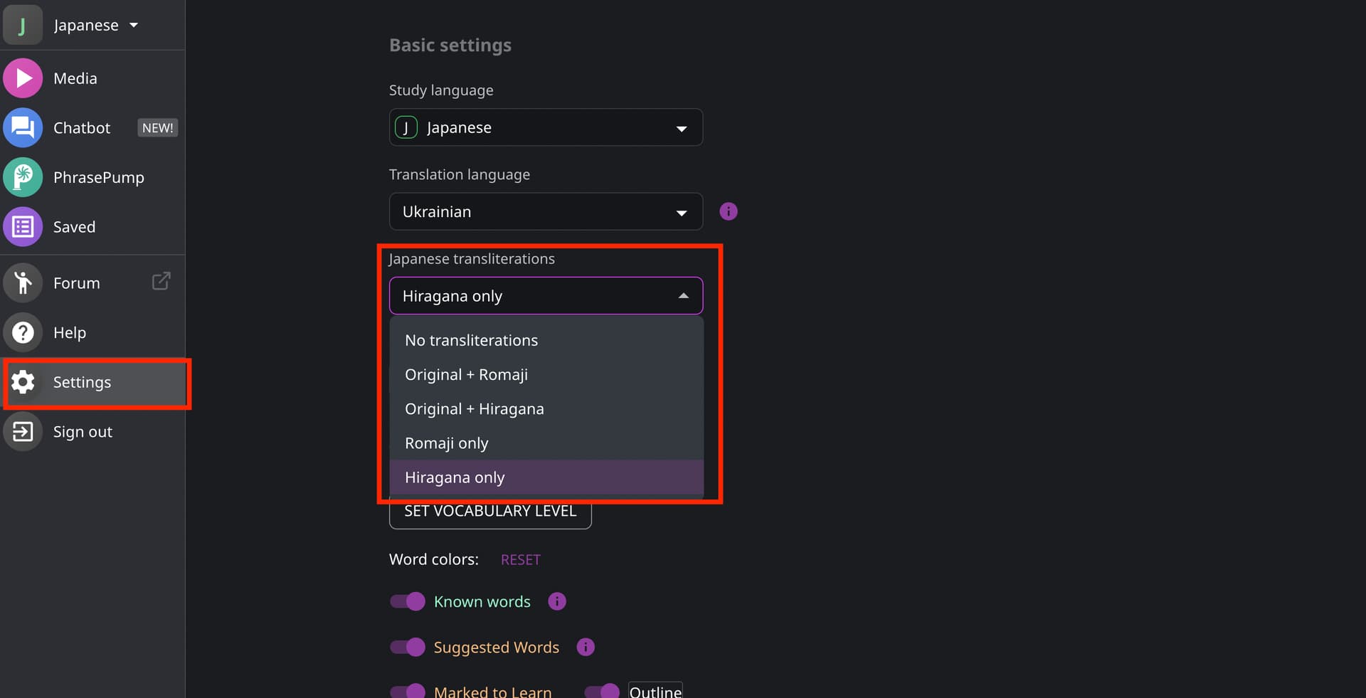 Note on transliteration (I believe that’s another way to describe romanji/kana, but I am not as familiar with this terminology): It doesn’t change in the full dictionary (I. e., the dictionary that pops up when you click on a word), but I do believe it changes in the mini dictionary (the dictionary that pops up when you hover over a word).
